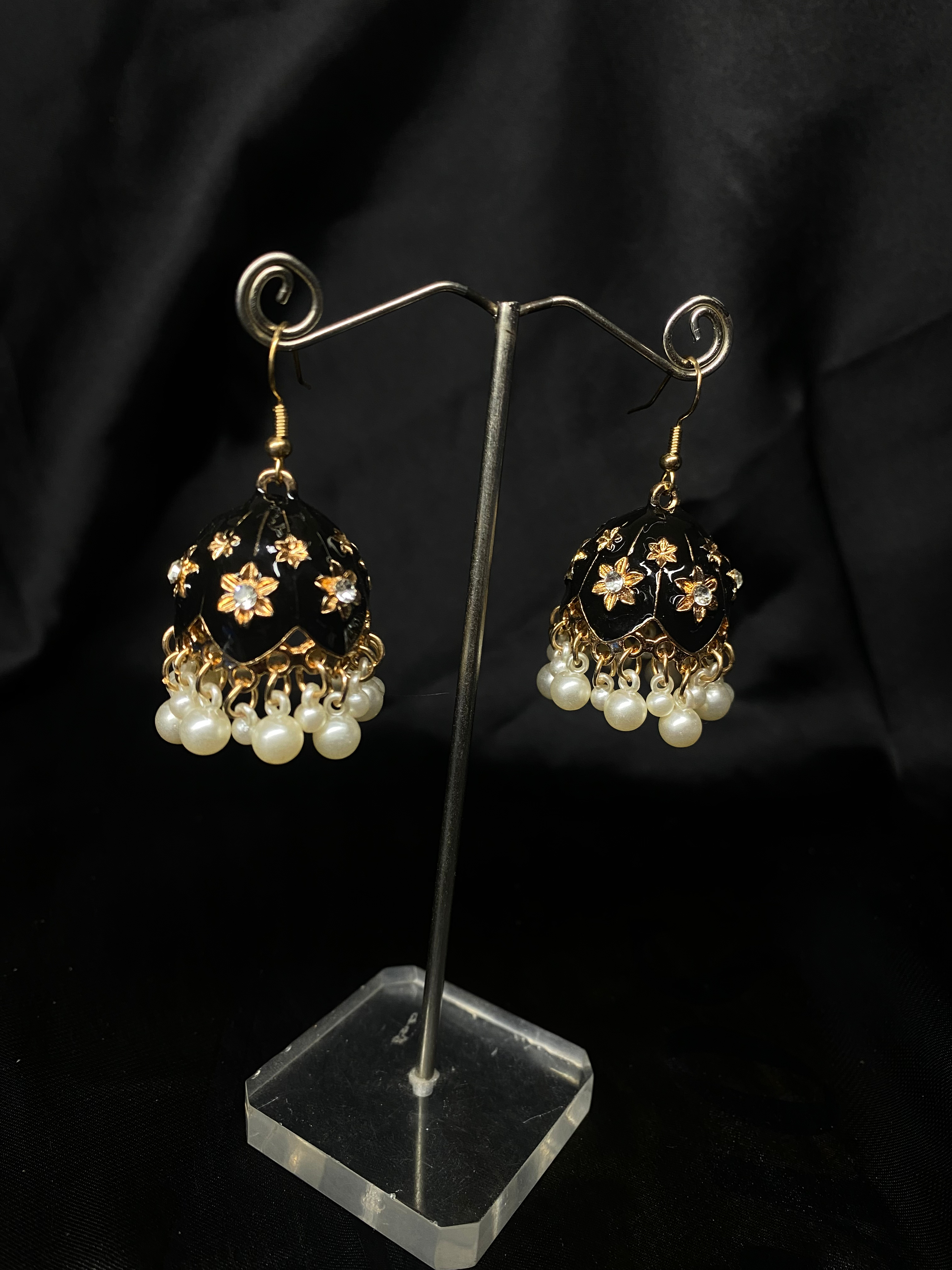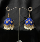 Add a touch of timeless elegance to your look with these stunning Oxidized Black Bell Jhumki. Designed with a glossy blue dome, adorned with delicate golden floral detailing and crystal accents, these earrings are finished with graceful pearl drops that sway beautifully with every movement.