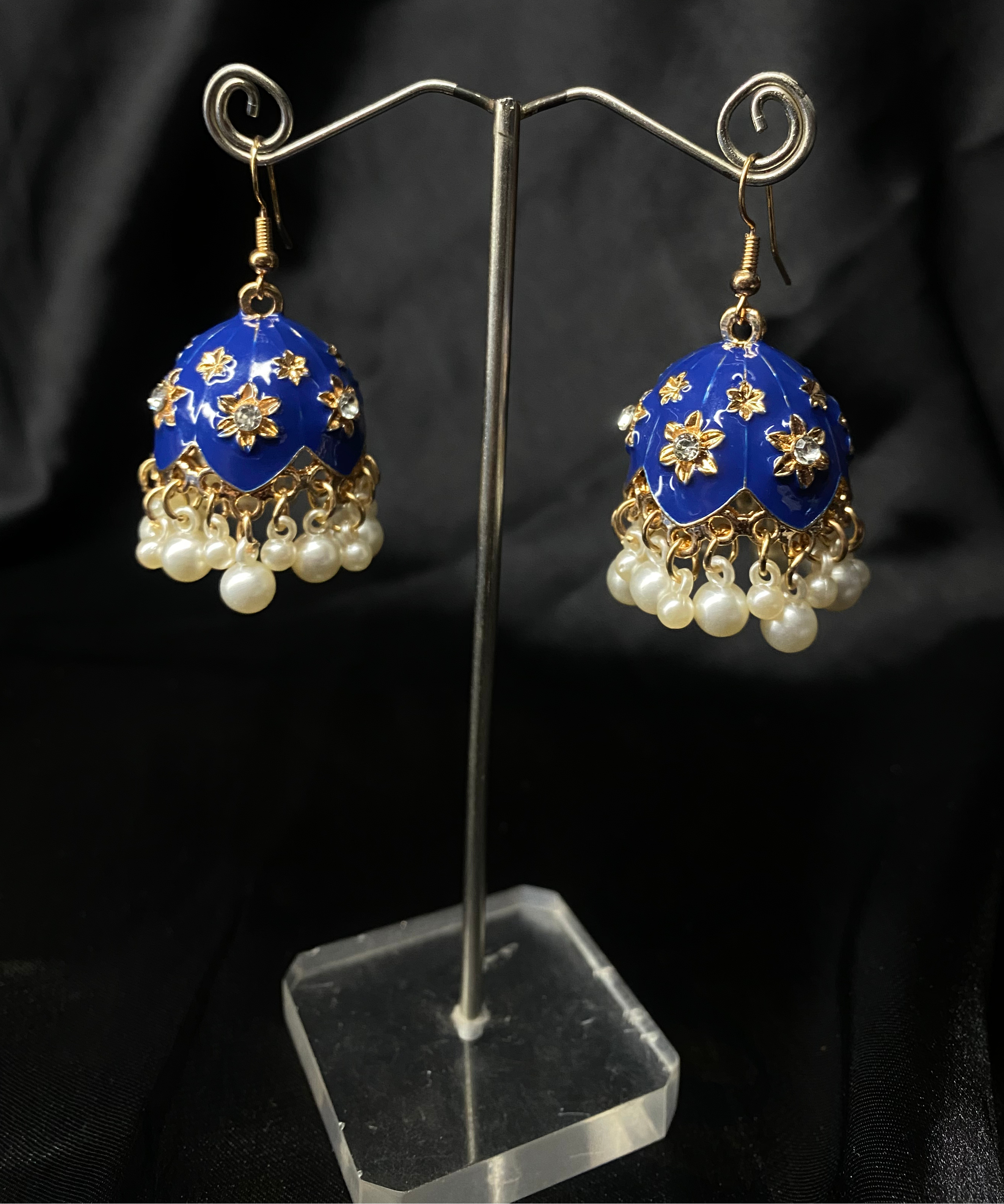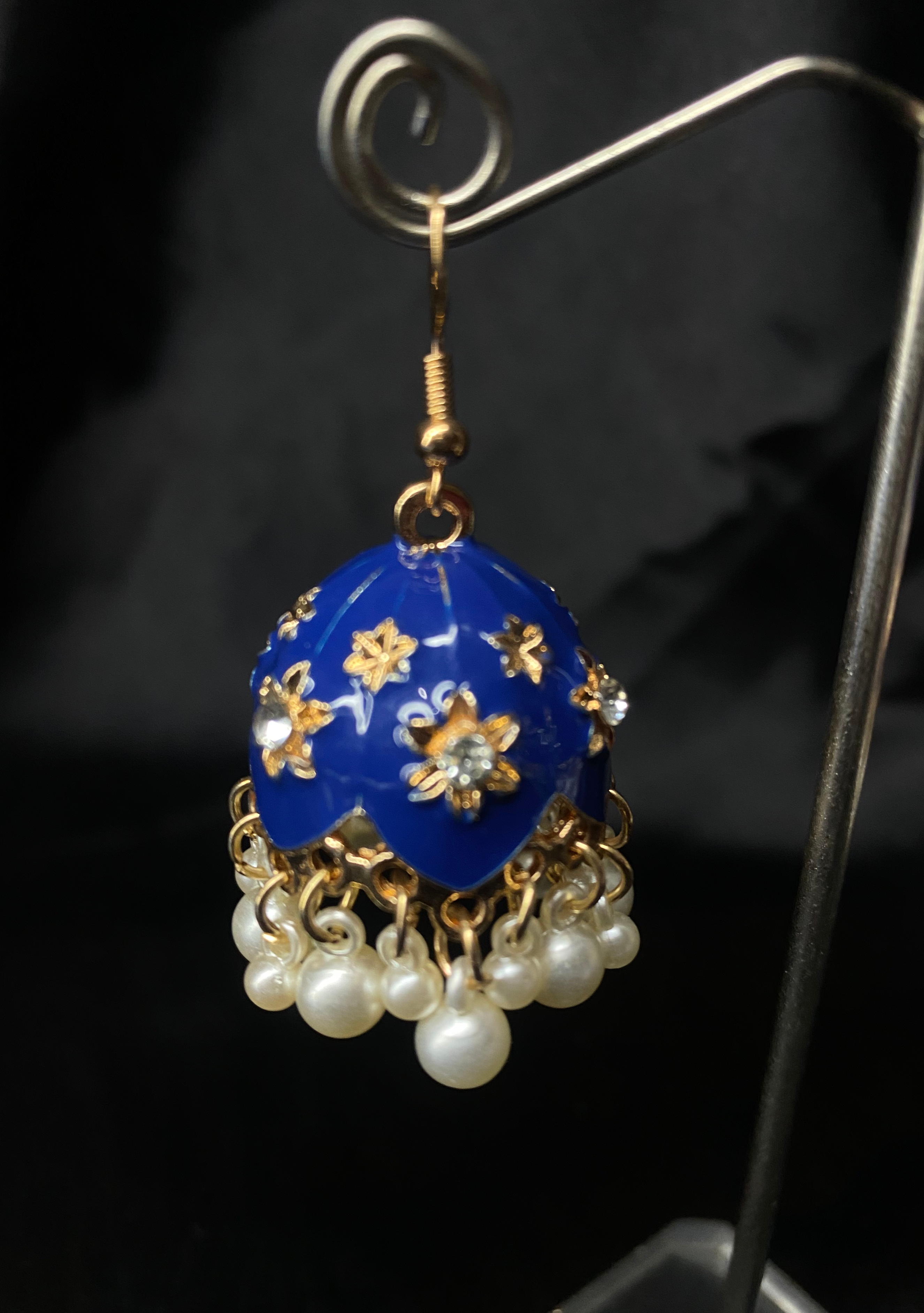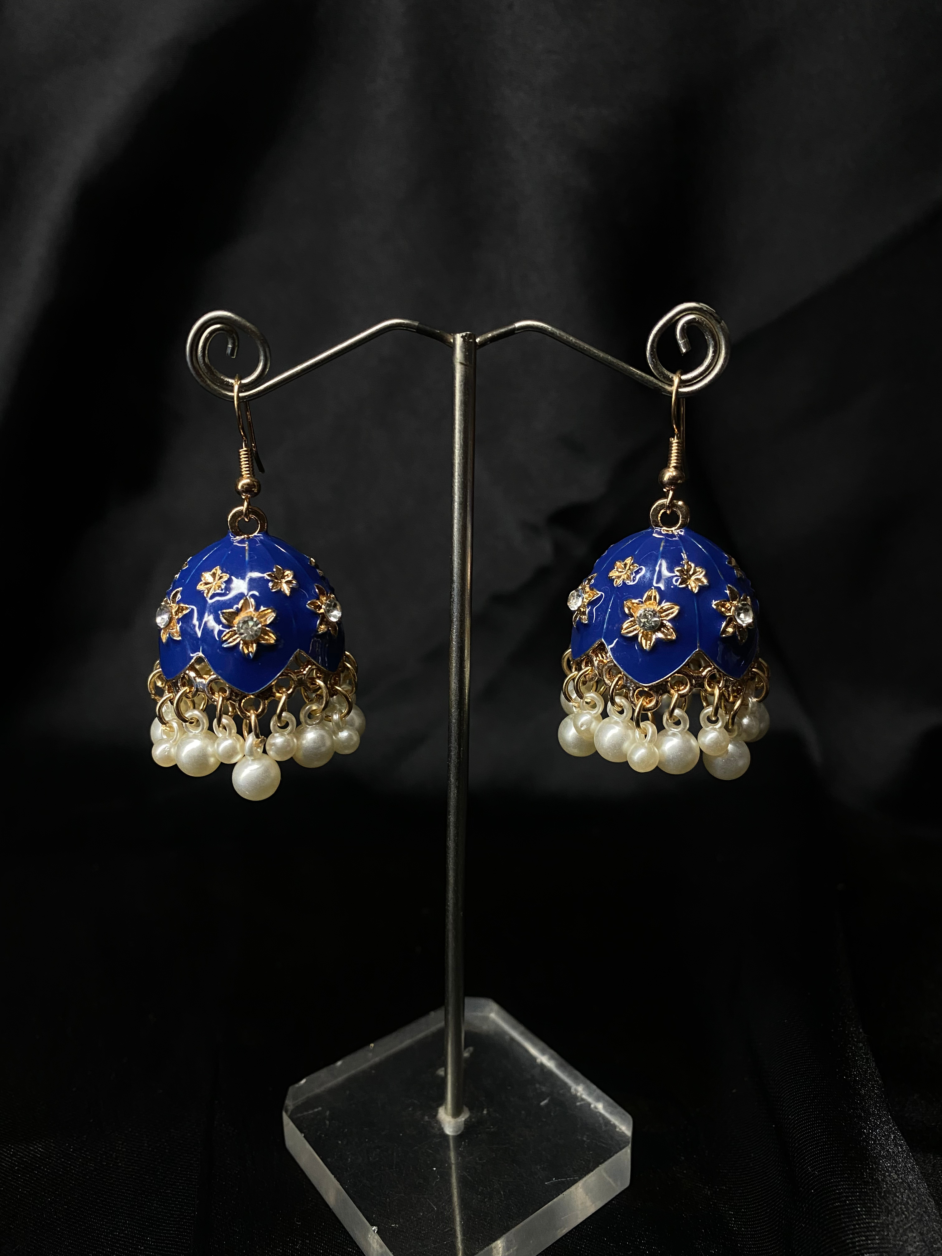 Add a touch of timeless elegance to your look with these stunning Royal Blue Jhumka Earrings. Designed with a glossy blue dome, adorned with delicate golden floral detailing and crystal accents, these earrings are finished with graceful pearl drops that sway beautifully with every movement.