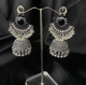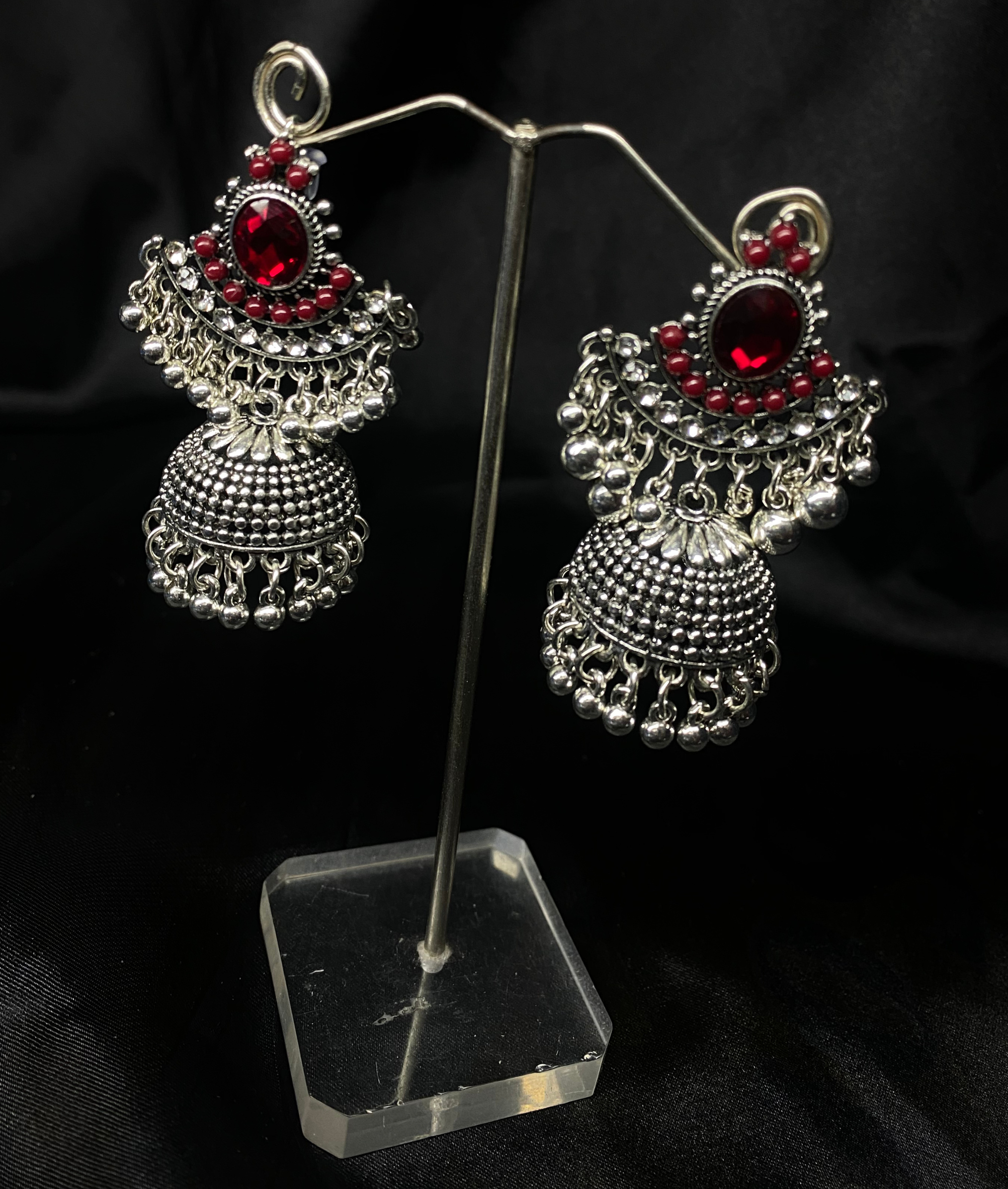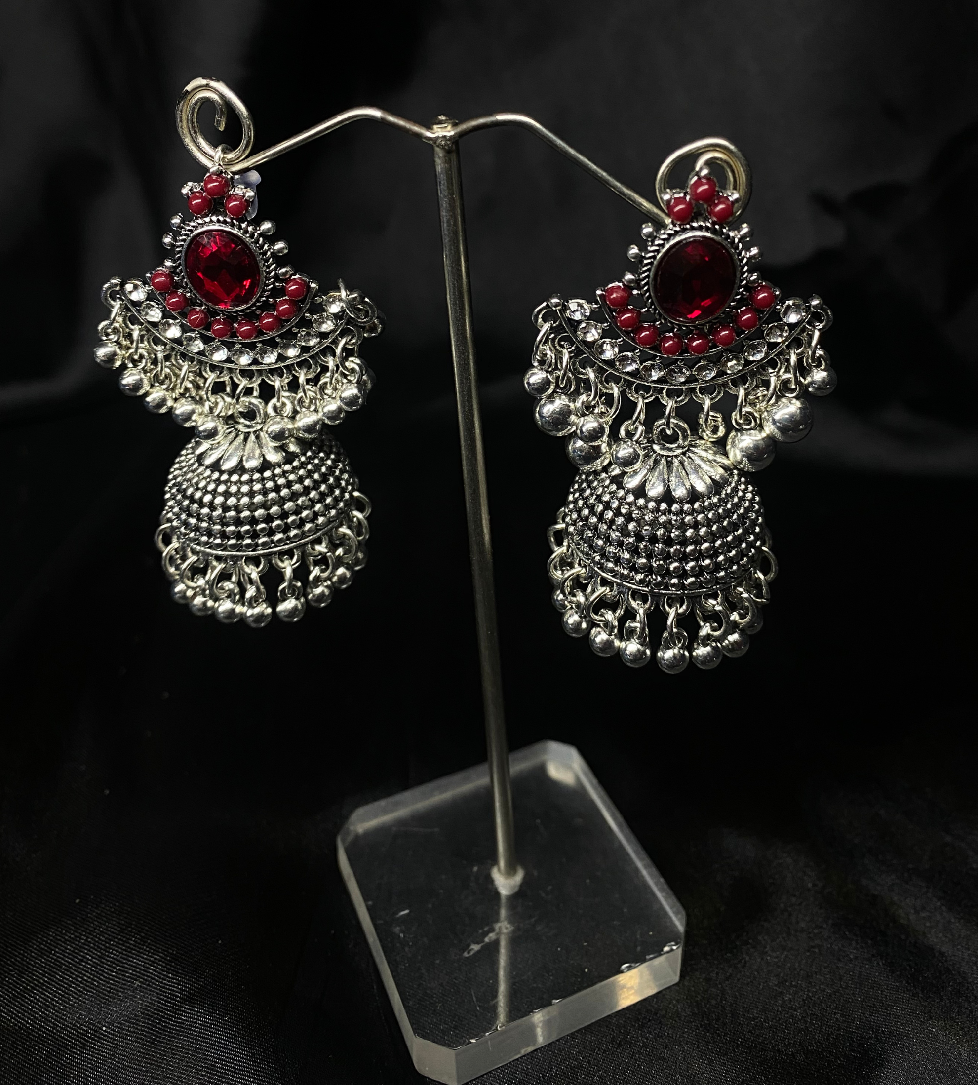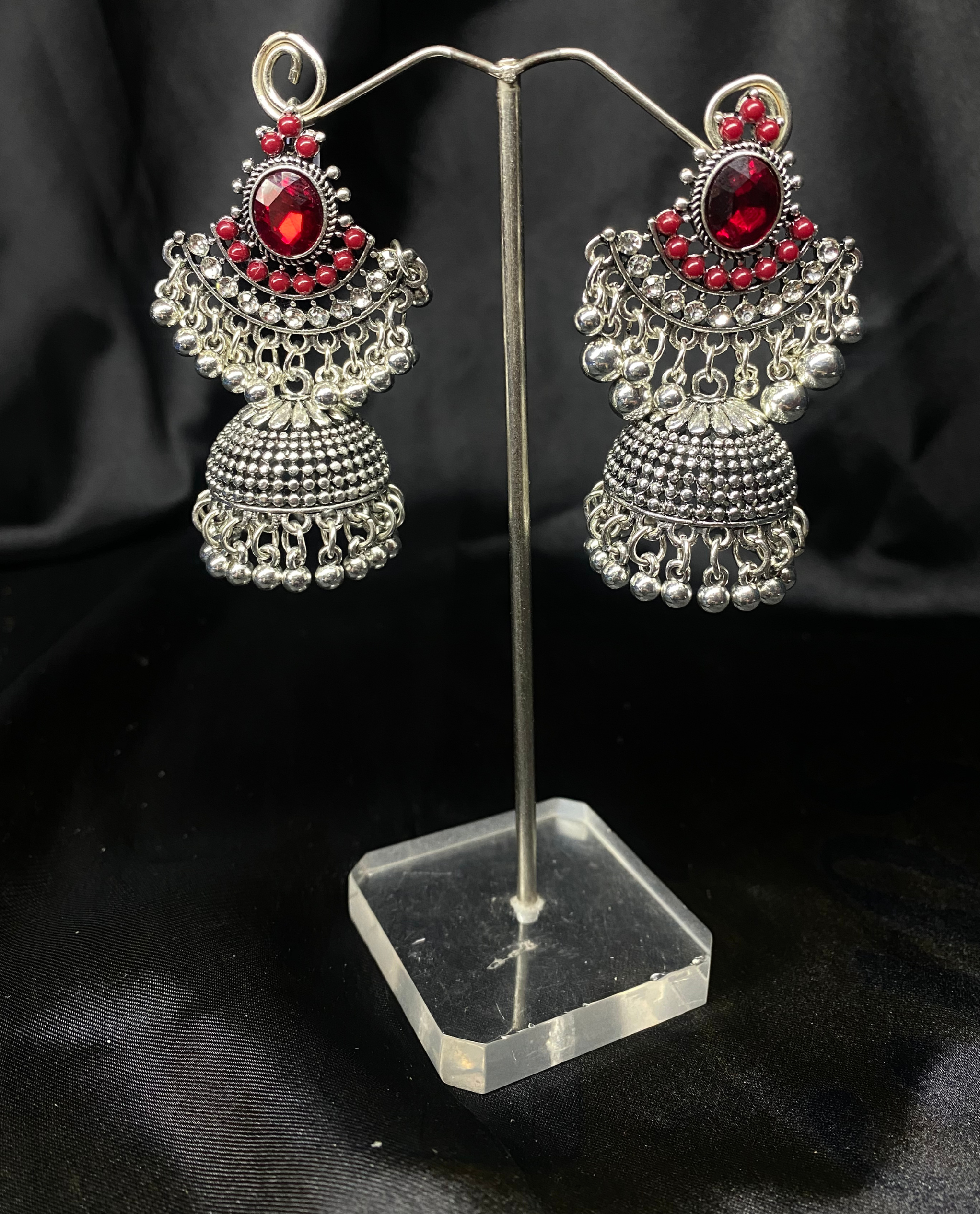 Oxidized Silver Jhumka Earrings With Red Stones.
