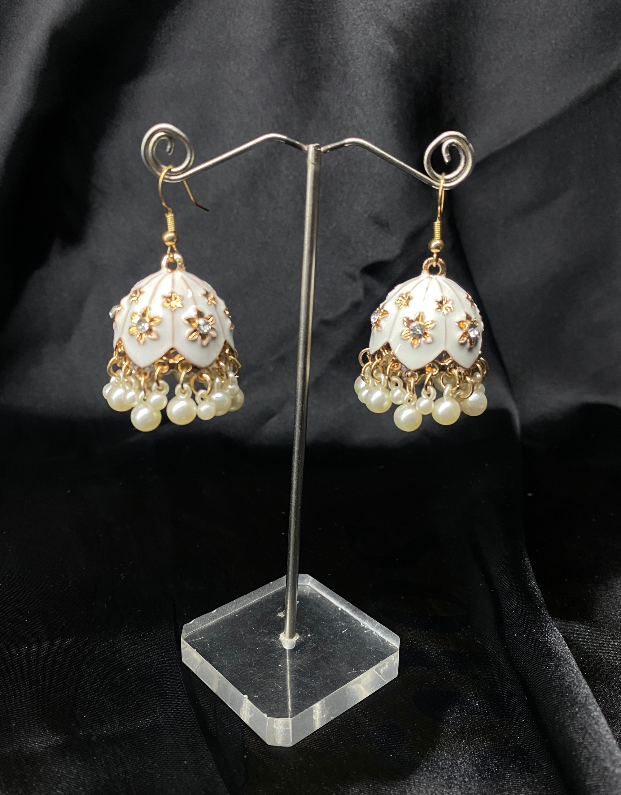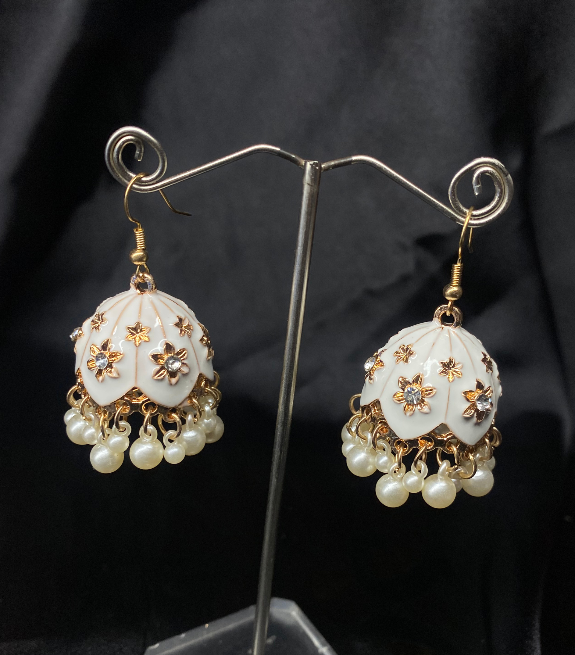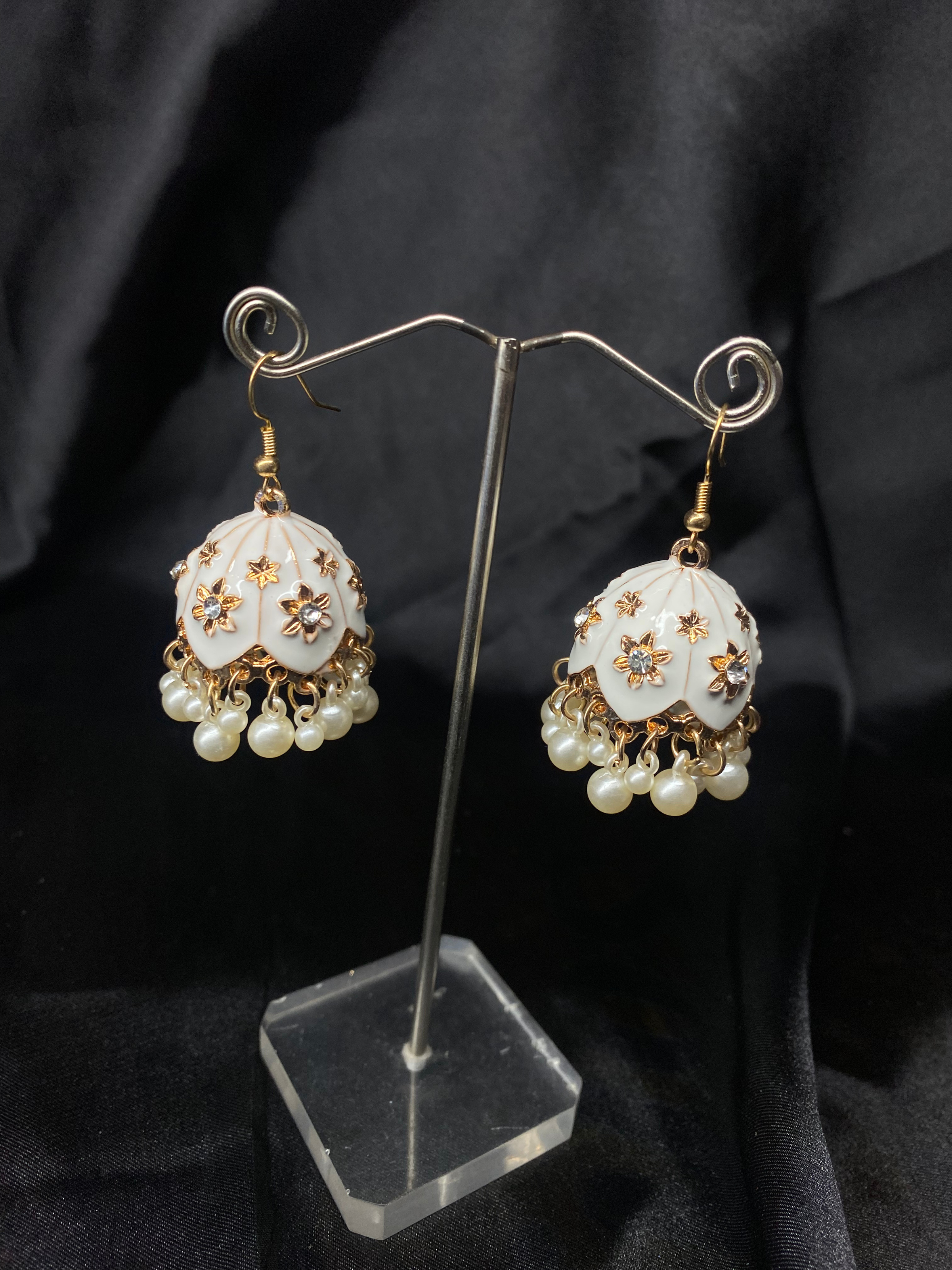 Add a touch of timeless elegance to your look with these stunning Oxidized White Bell Jhumki. Designed with a glossy blue dome, adorned with delicate golden floral detailing and crystal accents, these earrings are finished with graceful pearl drops that sway beautifully with every movement.