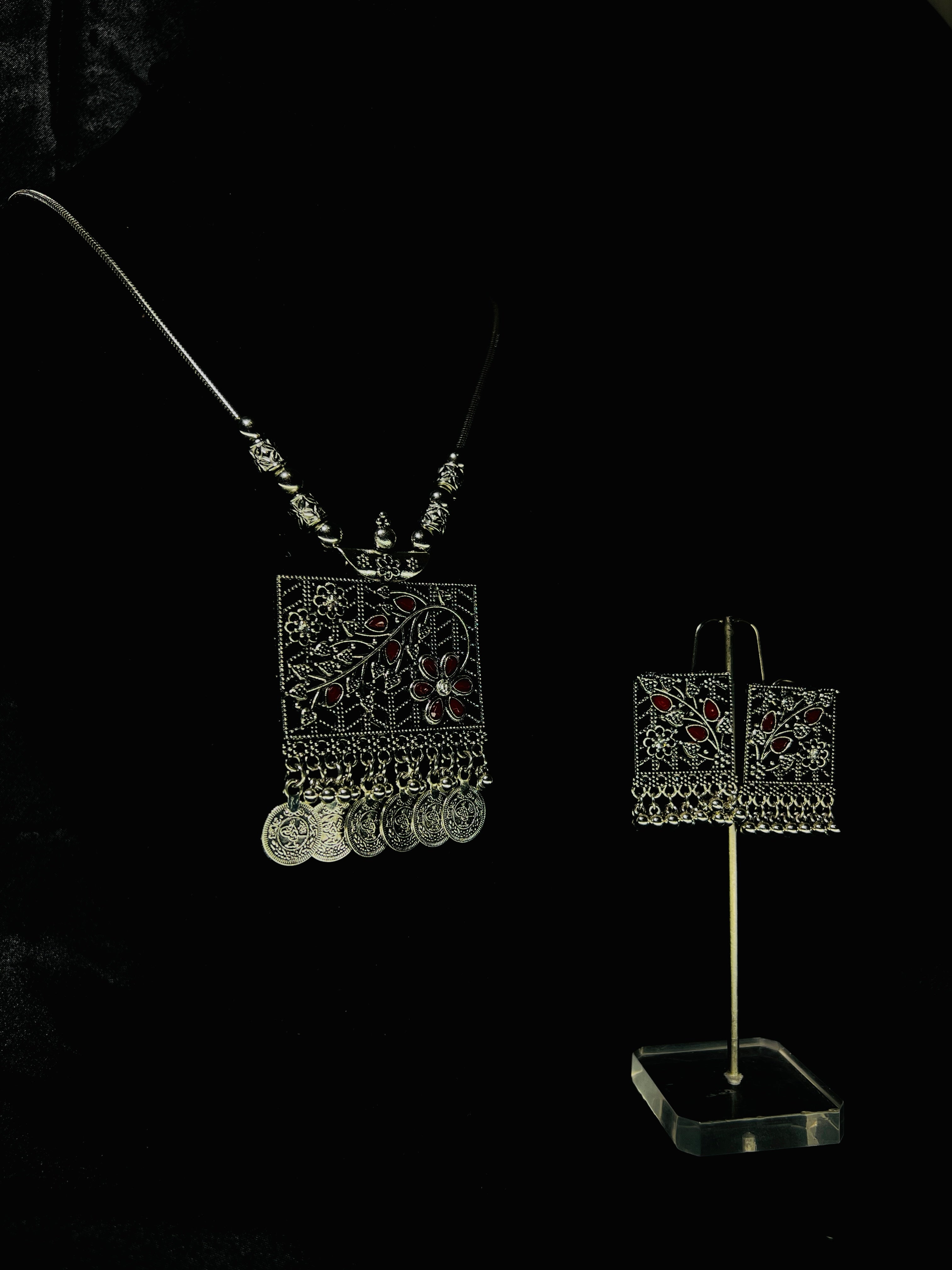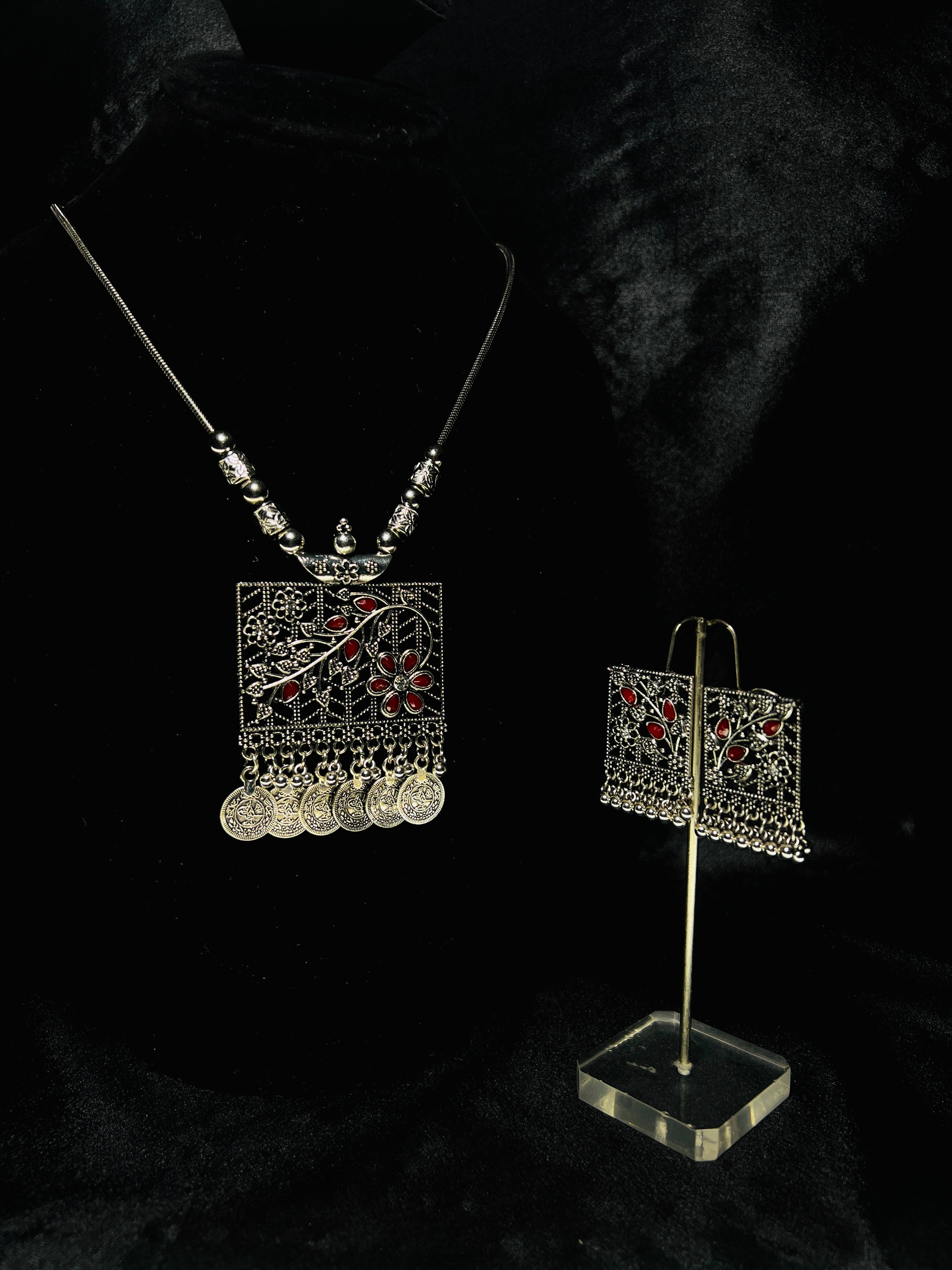 Oxidized Silver Necklace With Red Accents And Earrings Set