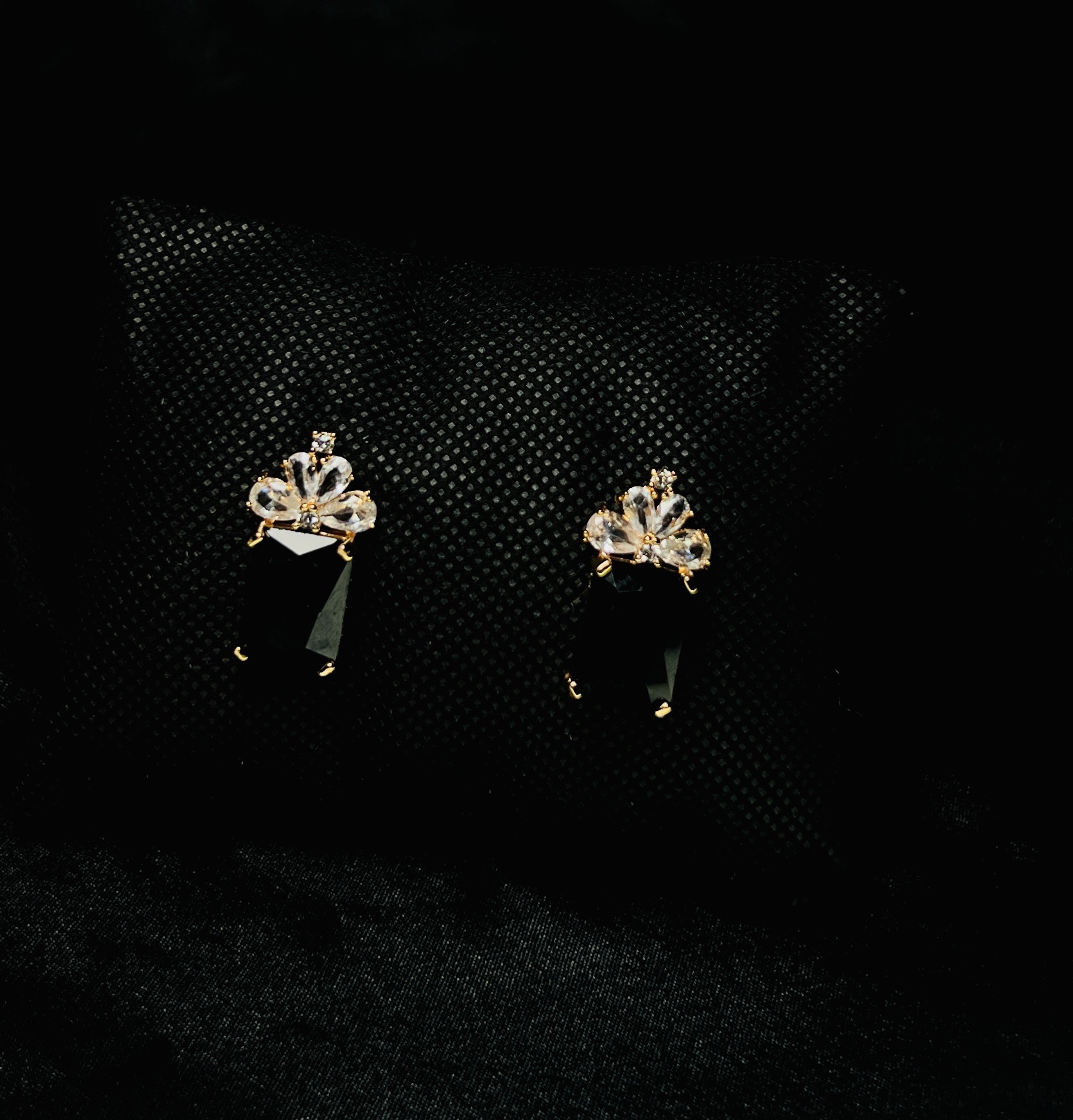 Turn heads with these striking black drop earrings, designed with a deep jet-black rectangular stone that exudes bold sophistication. The crown-inspired top is adorned with sparkling clear crystals, perfectly contrasted by a polished gold-tone setting. Elegant yet powerful, these earrings are ideal for evening wear, formal occasions, and statement looks, adding timeless glamour and refined luxury to any outfit.