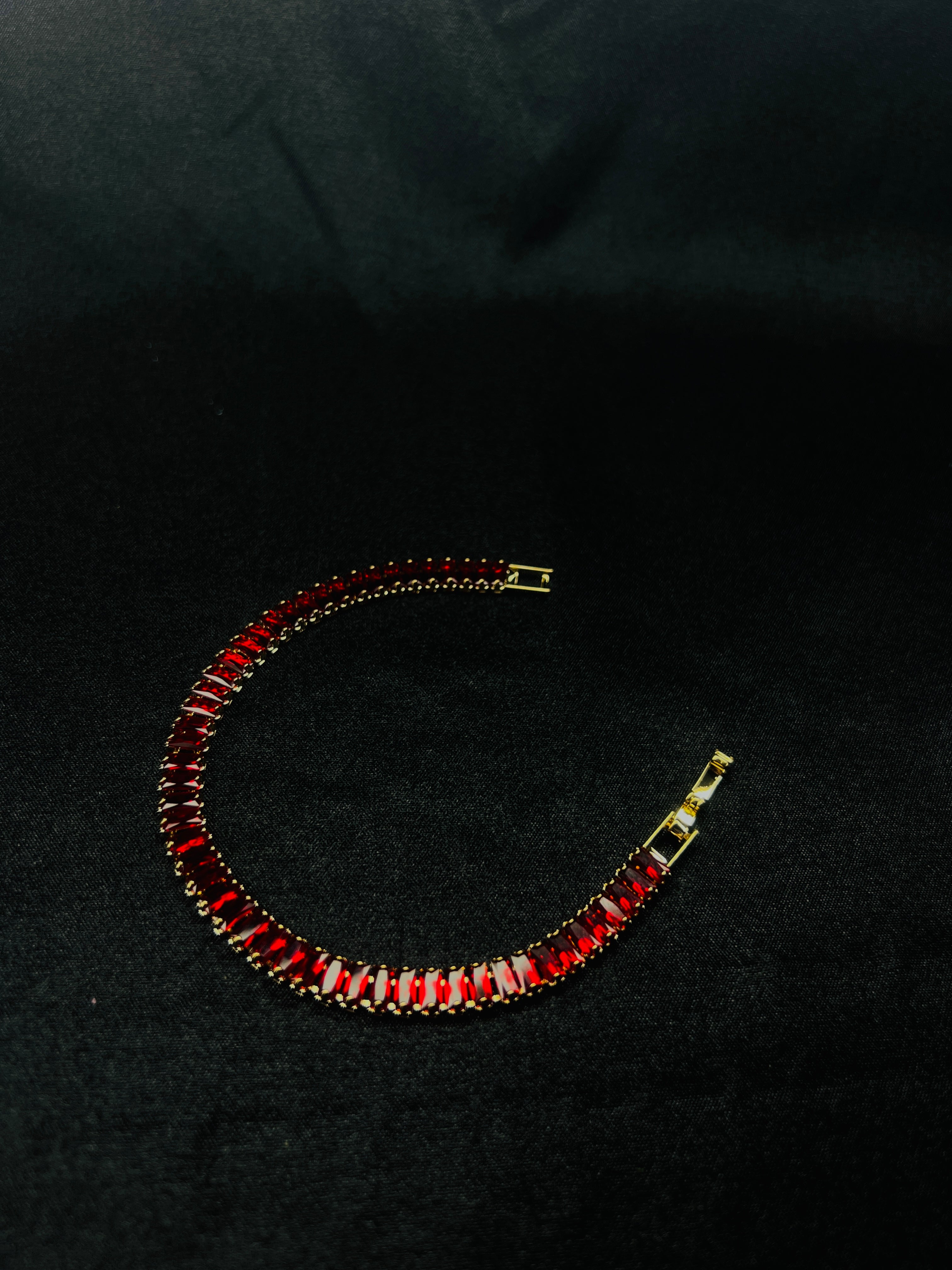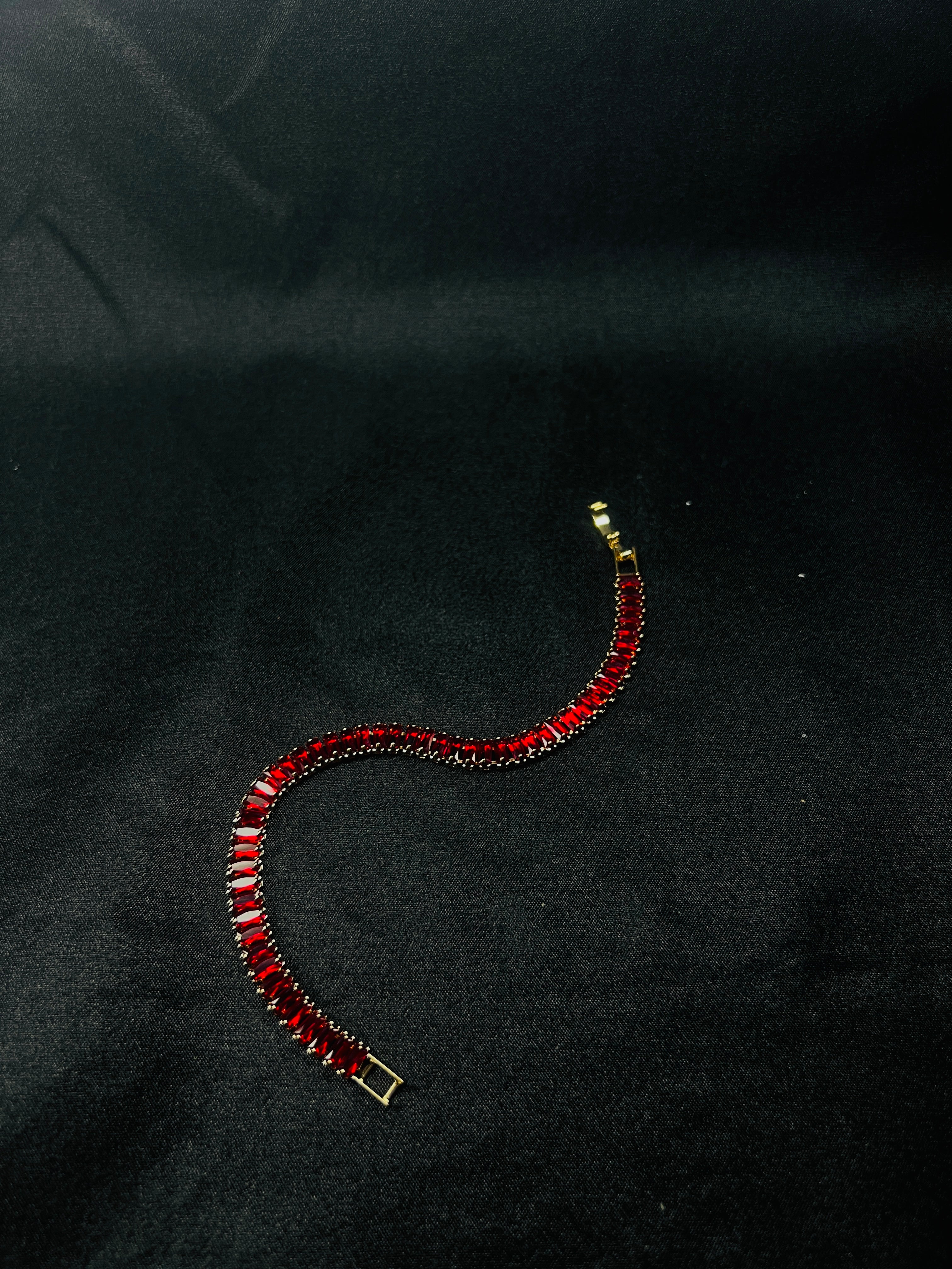 This striking Women's red stone embellished tennis bracelet exudes elegance and sophistication. Crafted from metal with intricate stone work, this piece is a timeless addition to any jewelry collection. Make a bold statement with this stunning accessory that effortlessly combines classic style with a touch of glamour. Brand name: Walvero Collection.