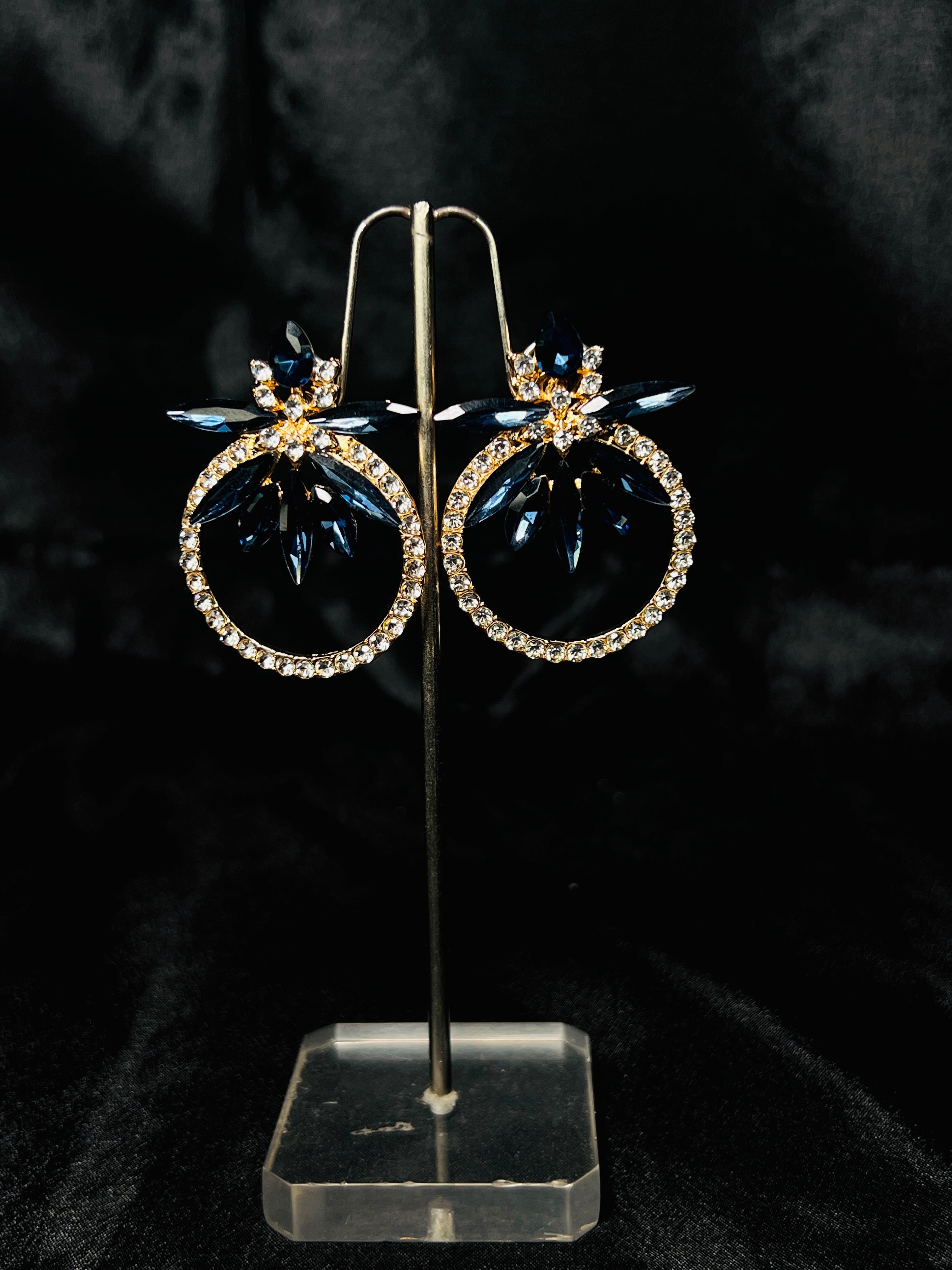 These stunning women's hoop earrings from Walvero Collection feature intricate stone work on dark blue metal, creating a bold and elegant look. Perfect for adding a touch of sophistication to any outfit, these statement earrings are a must-have accessory. Elevate your style with these one-of-a-kind pieces.